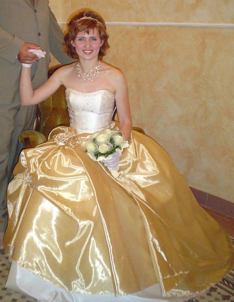 Продаю изящное свадебное платье (б/у 1 день)+ свадебный бонус:)Нижняя юбка и корсет - цвета "белого золота", верхняя юбка - под "золото". Корсет у свадебного платья жесткий, очень удобный, шнуровка сзади. Юбка пышная, многослойная + нижняя юбка с мягкими незаметными кольцами. На юбке два съемных цветка, лиф из атласа, расшит золотистым и белым бисером, шелковой ниткой, а шелковый шнурочек сзади украсит любую фигуру. Свадебное платье куплено в салоне Рейна, продающем эксклюзивные платья в единственном экземпляре. Модель Эдна. Свадебное платье действительно дорогое, выглядит очень торжественно, меняет цвет при разном освещении - от нежно кремового до золотистого. Очень красиво и контрастно смотрится на фоне зелени и осеннего пейзажа. В нем вы будете выделяться на фоне невест в белом, не останетесь незамеченной, особенно фотографами:) - наша фотография висит на стенде Тверского Загса и в салоне фотографий. Одевалось 1 раз, в идеальном состоянии, после химчистки. Размер 42-46, рост 165-180 (в зависимости от каблука). Цена - 12900р, продаю в два раза дешевле первоначальной стоимости. Возможен торг.Внимание! Цена свадебного платья снижена до 10000руб! Внимание, свадебный бонус:)Прилагается диадема и колье - мелкие камушки, бисер, под золото - всё подобрано идеально под свадебное платье. Правда, колье я бы хотела оставить себе, но дам покупателю платья бесплатно попользоваться:). Приезжайте мерить! (г. Москва, м. Динамо)